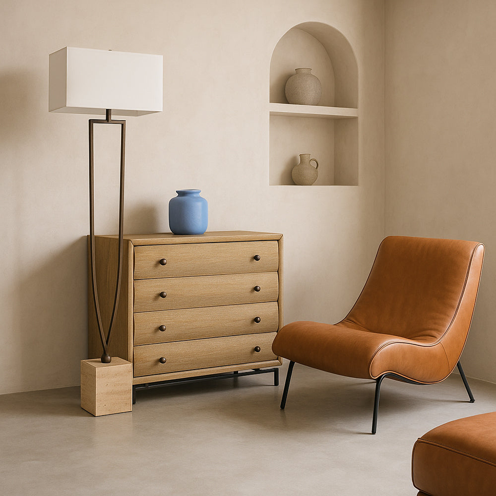 Featuring mindi wood in a warm natural finish, four curved drawer fronts, and complementary bronze hardware, this accent chest effortlessly combines natural elements with industrial undertones, making it a stylish and functional addition to any space.