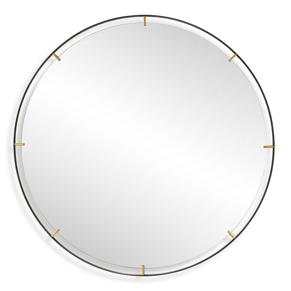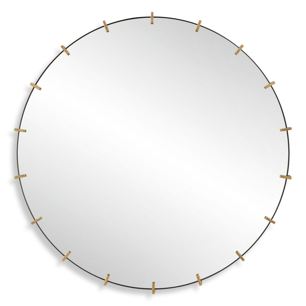 Rounded corners and a thick metal band frame the Payton Mirror. It features a gold finish with a slim inner tube and clear bevel. Hang vertical or horizontal in a foyer.