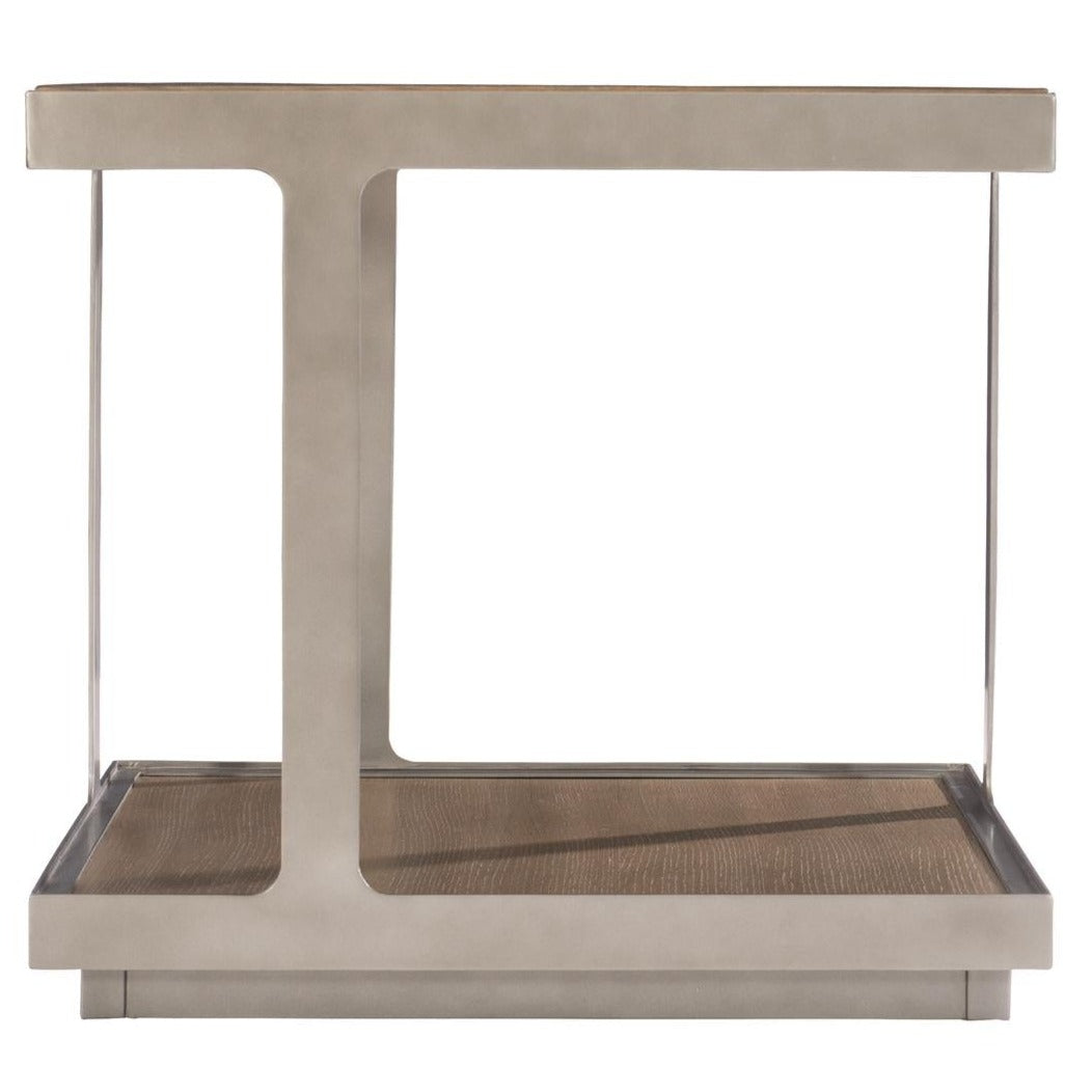This end table combines metal and wood in a clean, asymmetrical design. Quartered oak veneers in portobello finish bring a warm tone, while a steel frame finished in antique pewter contributes a sophisticated cool.