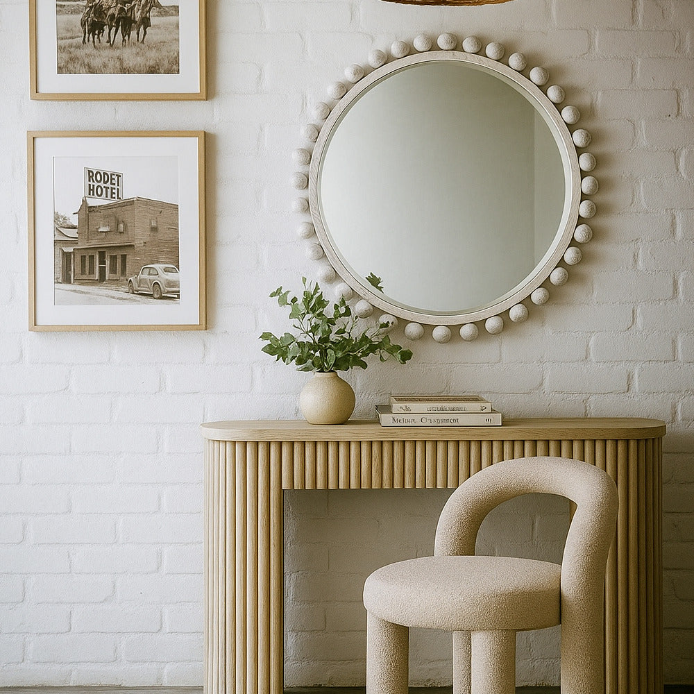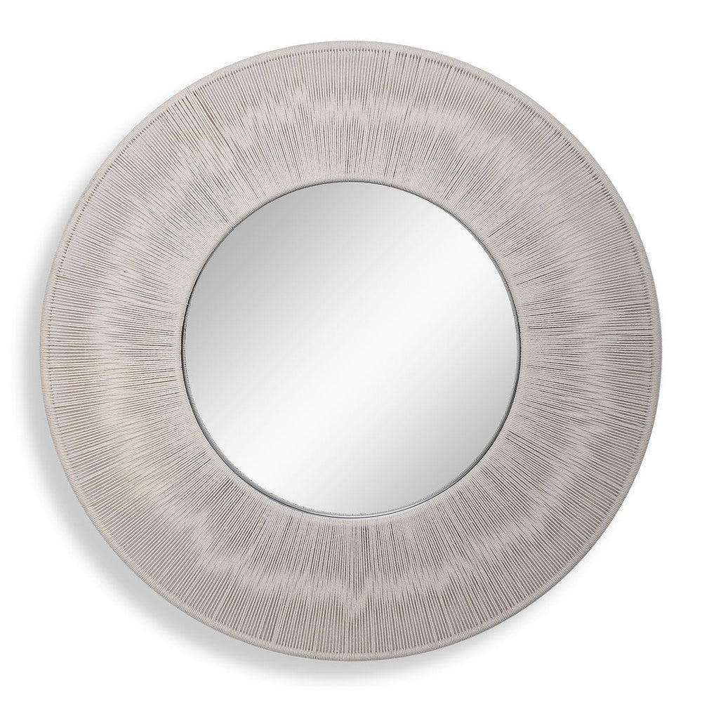 Inspired by natural surroundings, this round mirror is the perfect addition to any mountain or seaside retreat. The rounded frame is made of natural woven banana plant accented by a rattan inner edge. Mirror has a generous 1 1/2" bevel.