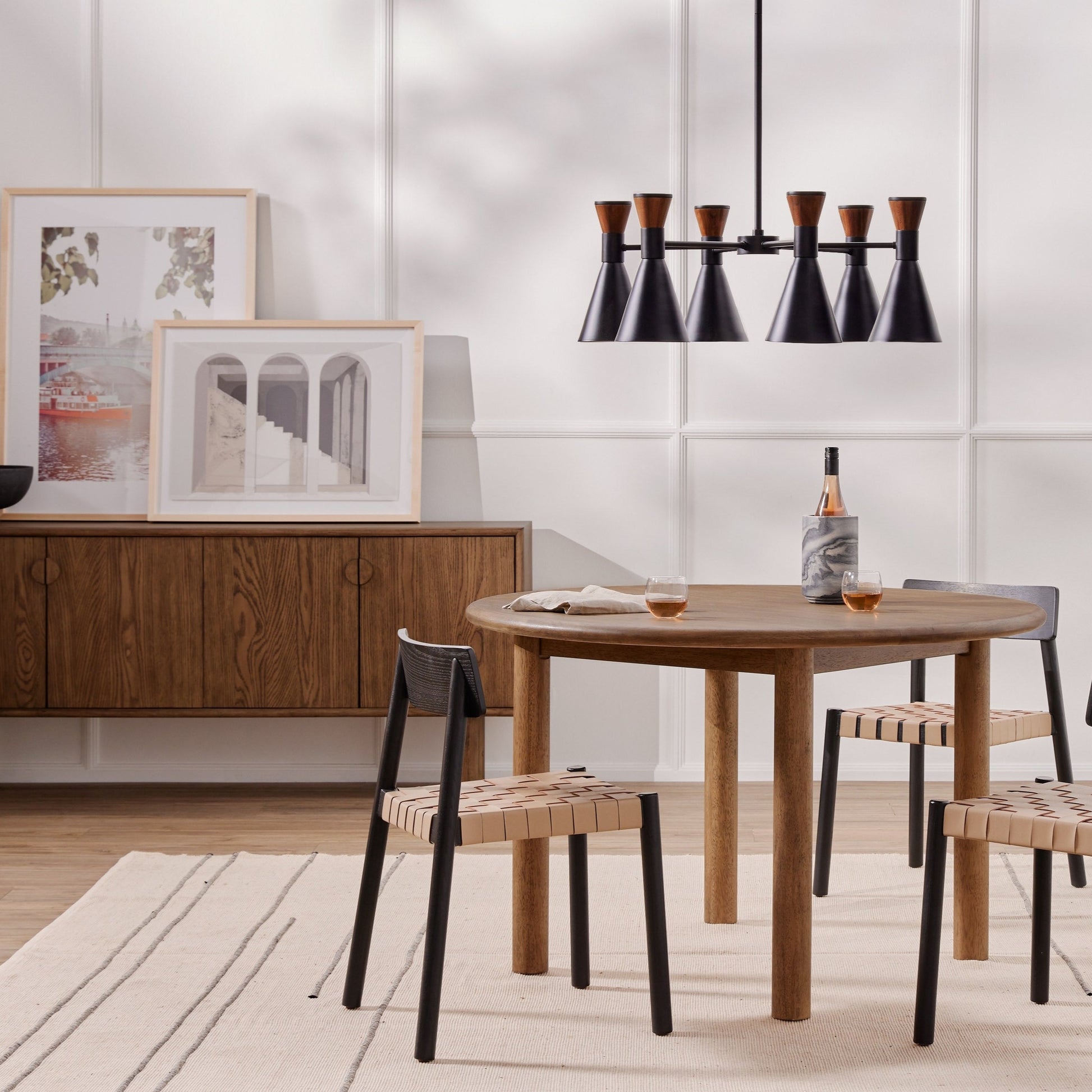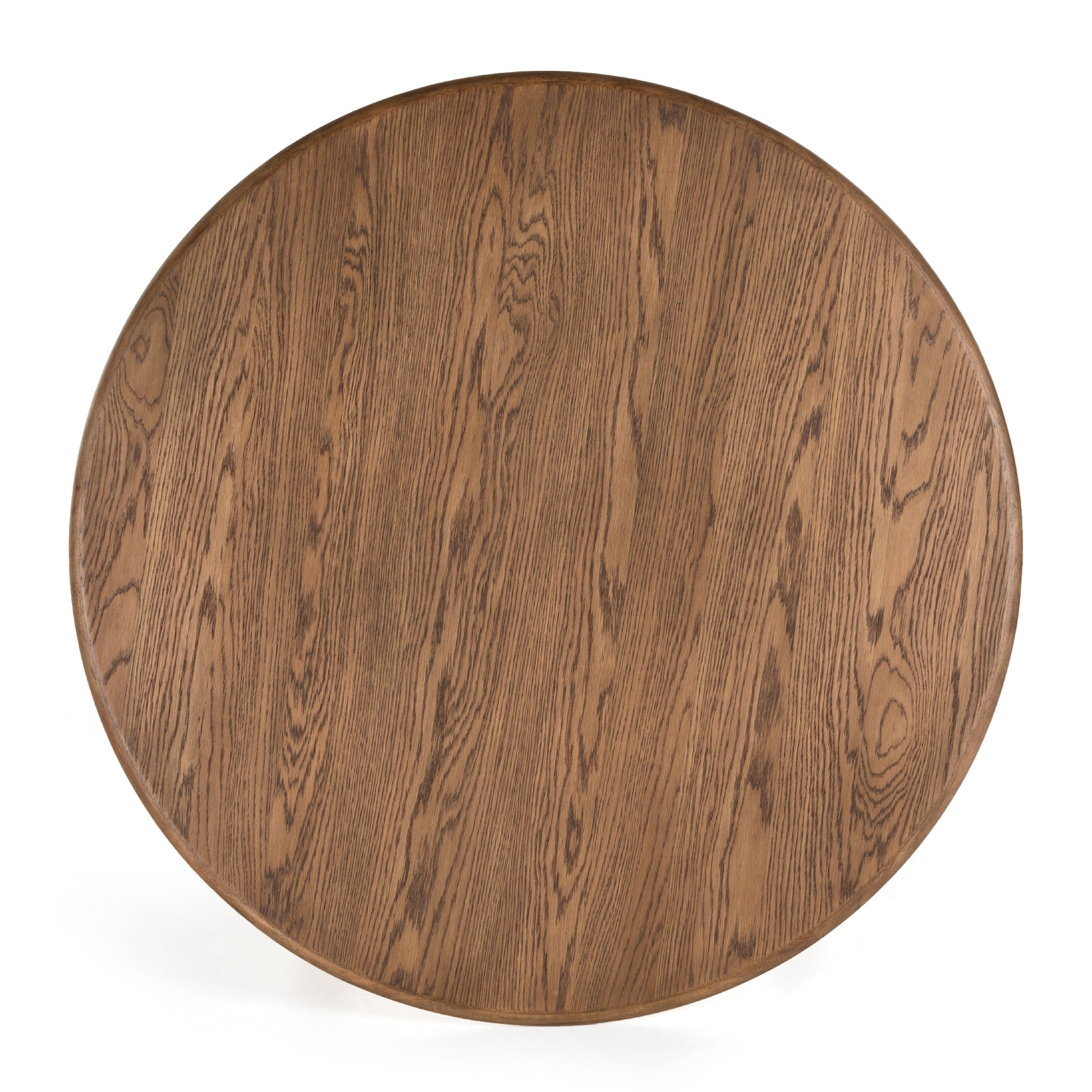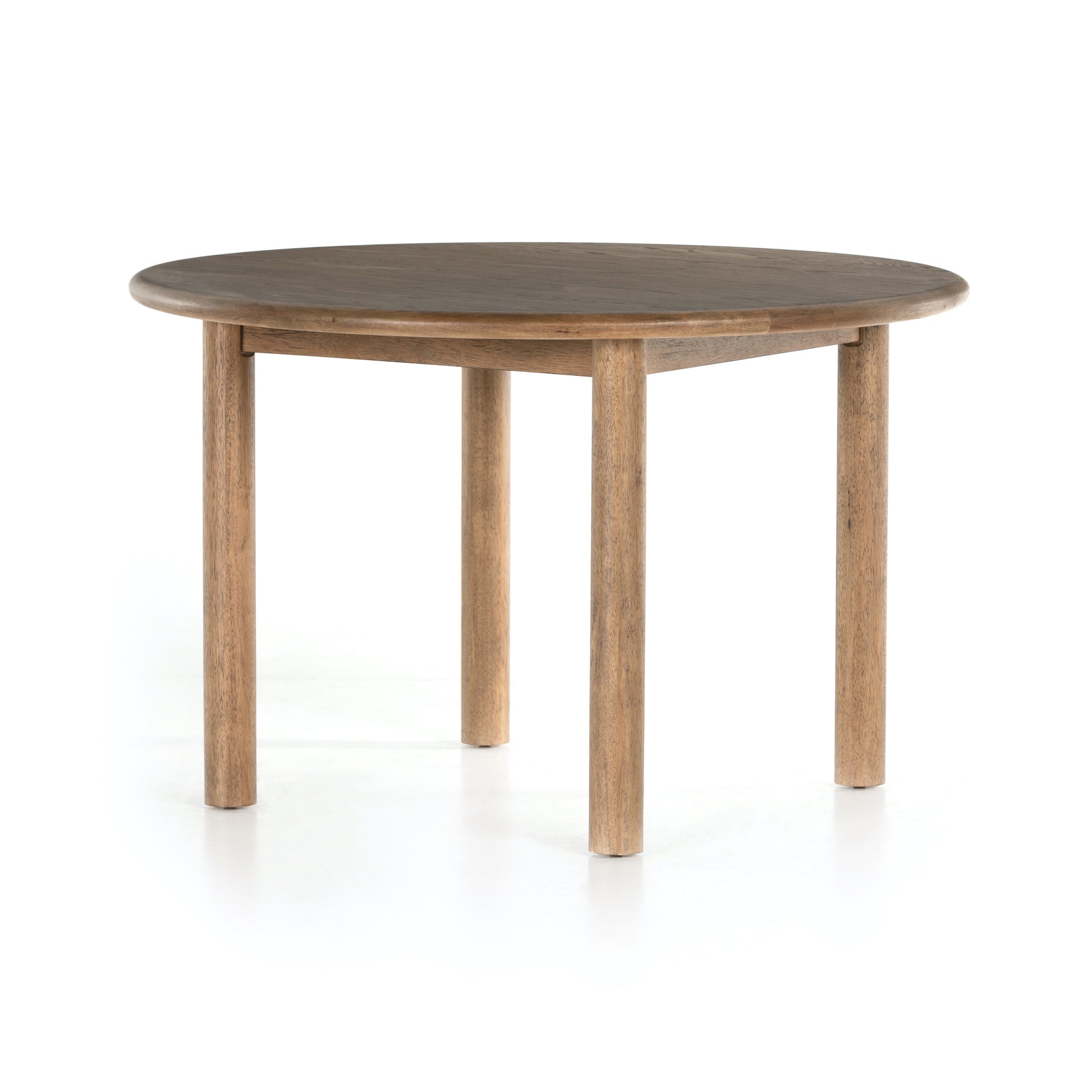 Toasted finish, dowel-style legs of solid parawood support a rounded oak tabletop with bull nose edging, adding intrigue to an otherwise beautifully streamlined style.