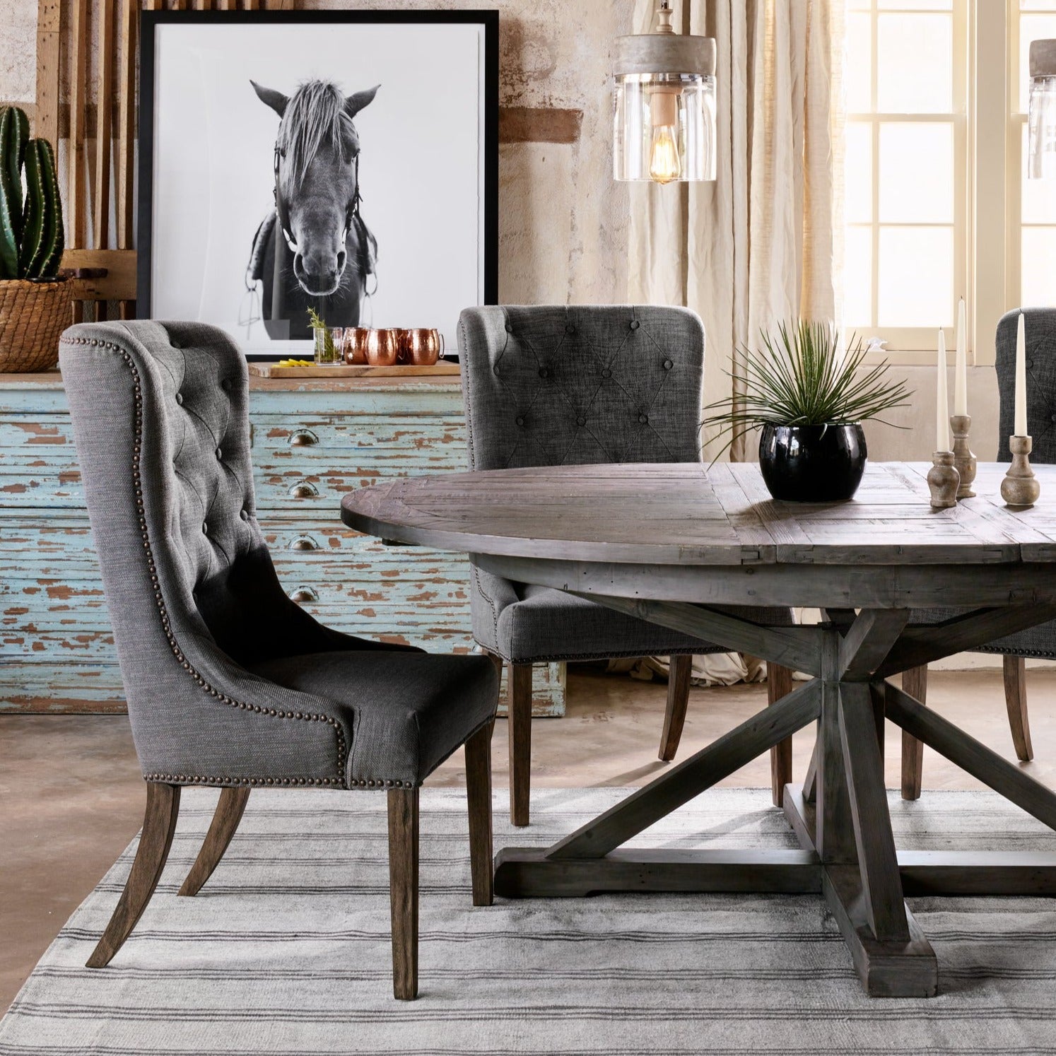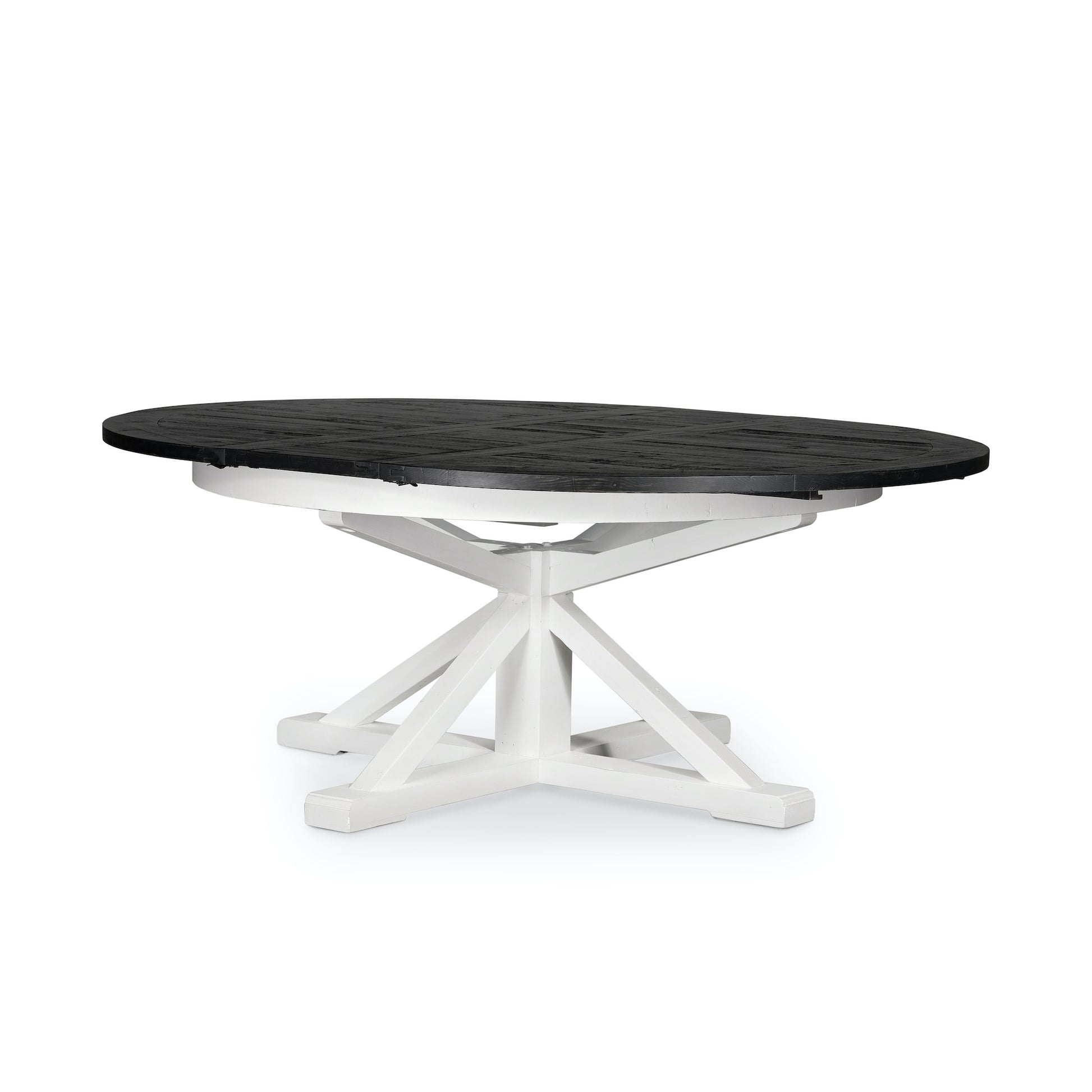Round farmhouse table draws the eye with organic graining indicative of its reclaimed materials. A compelling architectural base. Color options a shown in phots. Extends from .