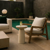 Round metal outdoor side table cast in weather-resistant bronze aluminum. Its slim pedestal profile saves space while keeping drinks, books, and decor within easy reach on any patio or balcony.