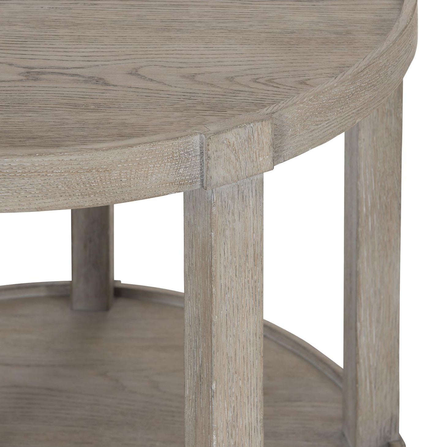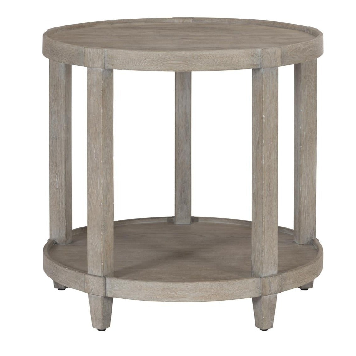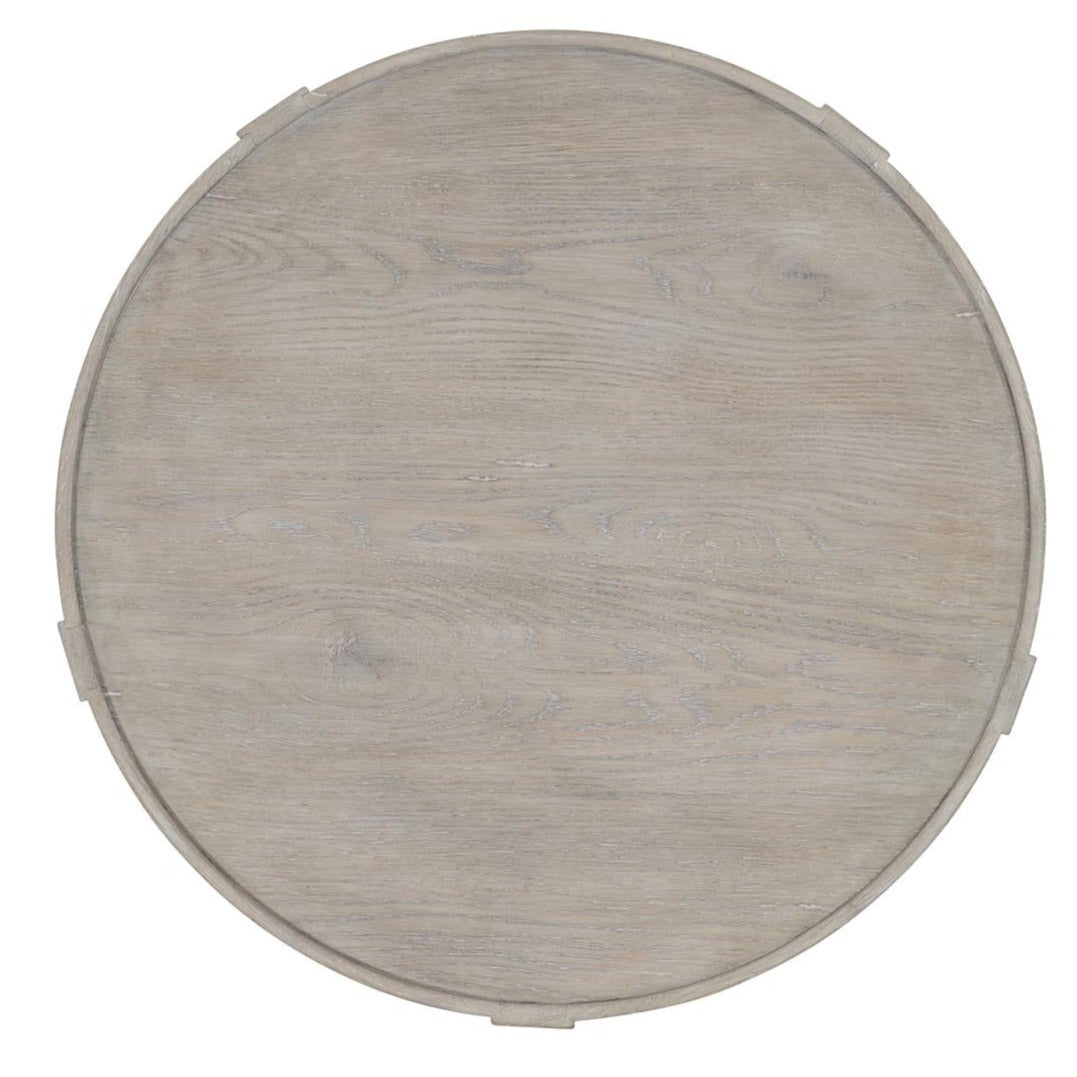 This texture of cerused oak and a layered Pewter finish create the look of weathered wood.Table has two sweeping circles joined with tapered legs. A wood band around the top and shelf offer a design in a simpler form.