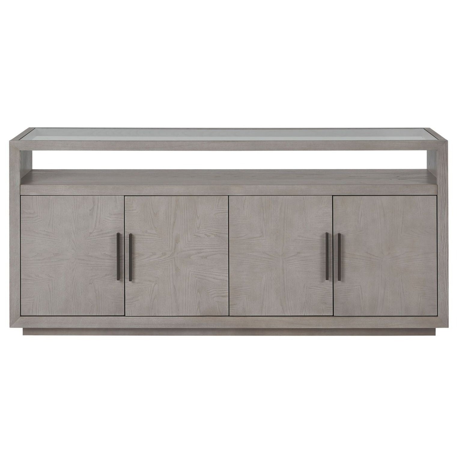 • An ultimate storage statement piece, the Modern Server brings a confident refinement to any dining space with a contemporary body of four doors, an open-air display shelf, an inset glass top and sleek bar hardware.