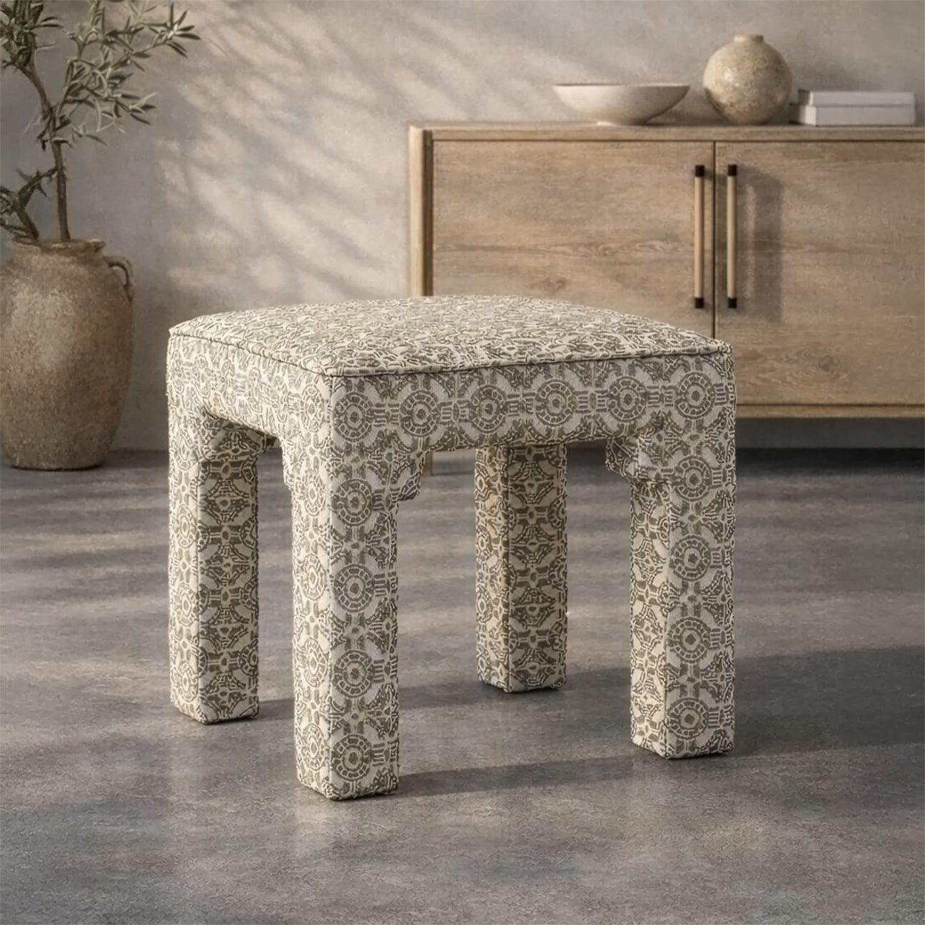 Style a closet with a small closet bench in olive green. This seat is 18" X 18" inches and is finished in a boucle fabric with a lattice medallion pattern.