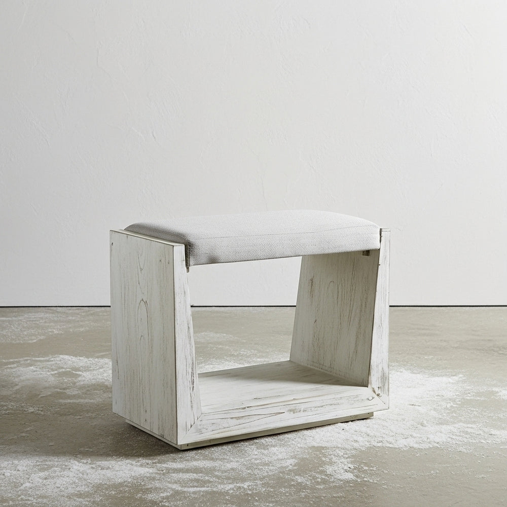 This woven rattan bench blends coastal style with casual charm. It features a small wood base, antique brass foot caps, and a soft white upholstered seat.