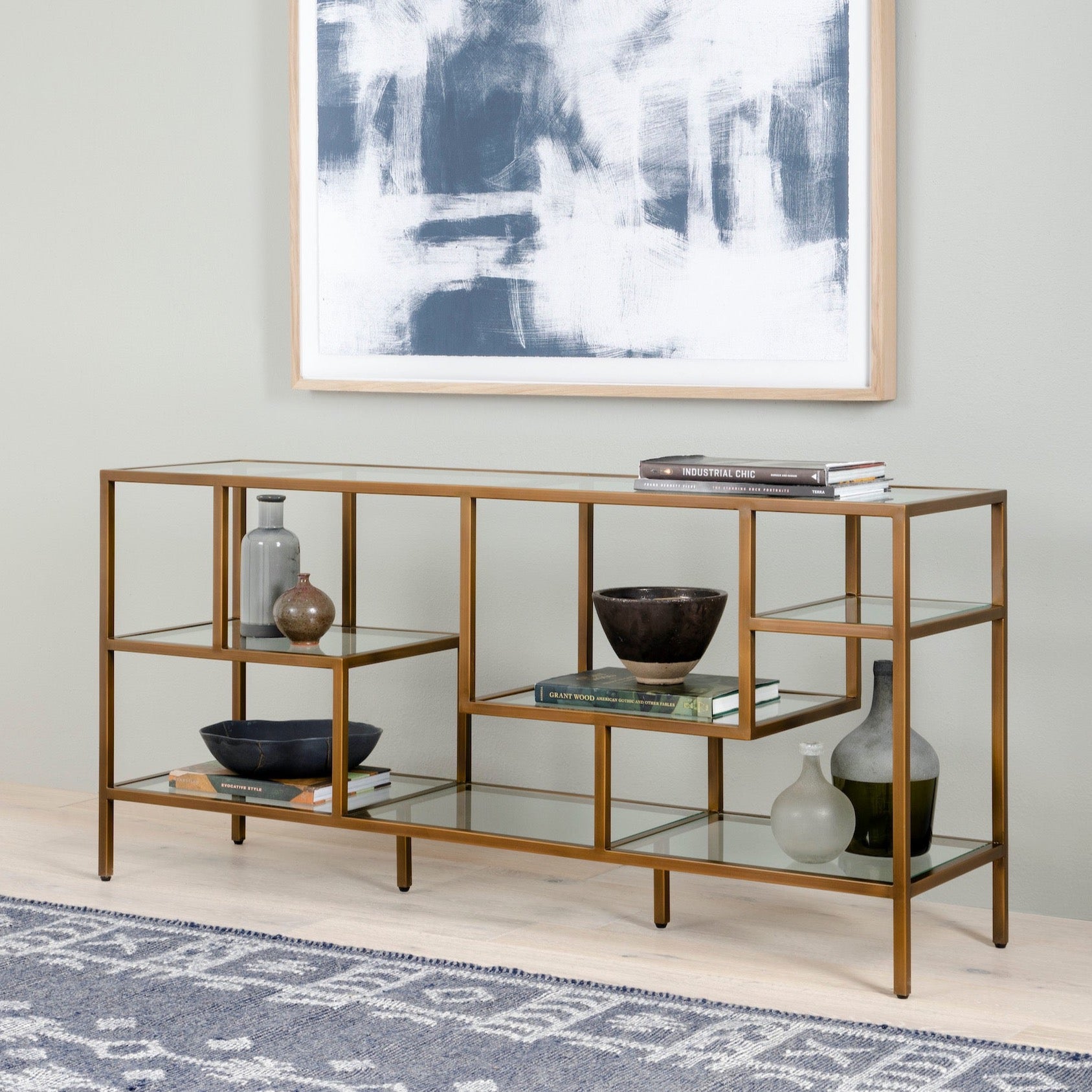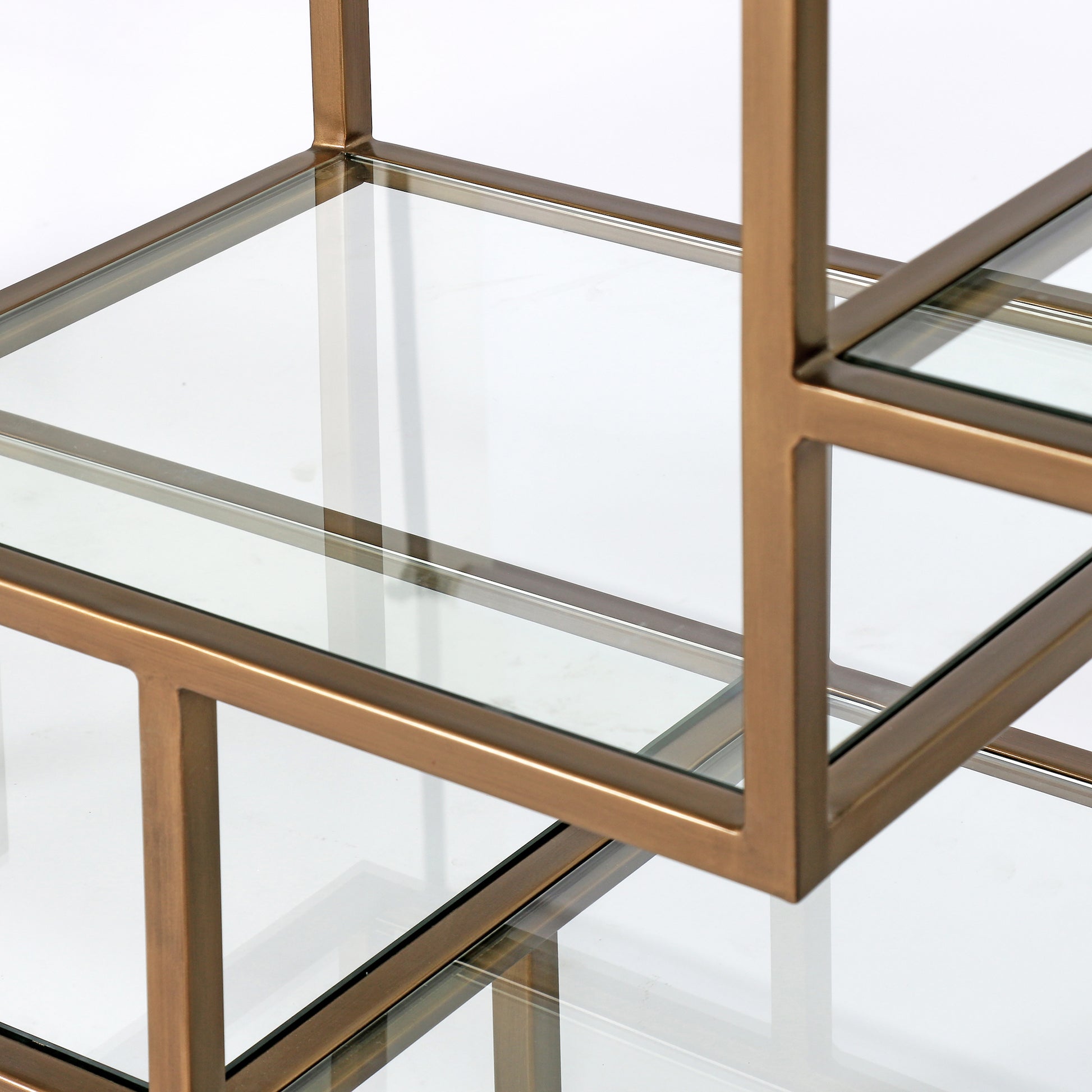 Staggered shelves play across slim and simple antique brass-finished iron framework. Clear glass brings a glamorous air to an industrial design aesthetic.