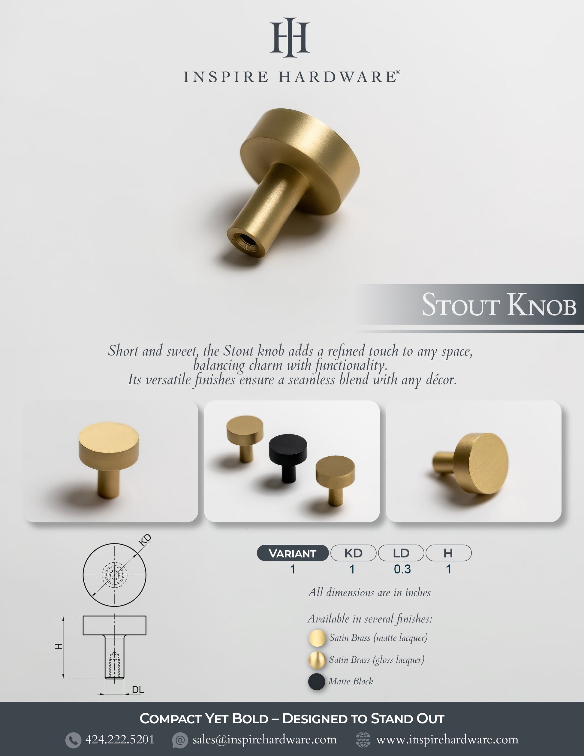 Elevate your home decor with our Stout Knob. Crafted from solid brass, this knob seamlessly blends modern simplicity with a touch of contemporary flair. Choose from a selection of popular finishes to match your personal style. Upgrade your space with this sleek and stylish addition., this knob is the perfect addition to any home decor. Upgrade your space with a touch of personality. (Get your knob on with Stout - it's more than just a handle!)