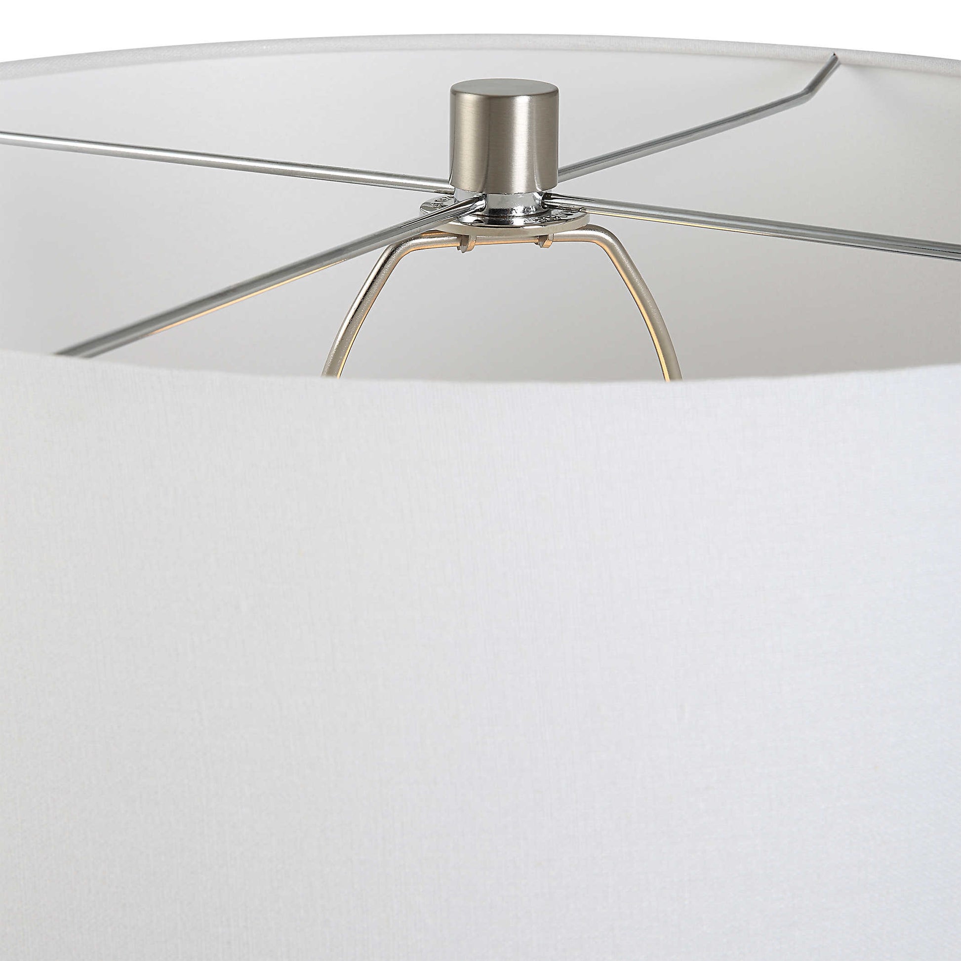 A tapered ceramic base features softly scalloped sides finished in a lightly distressed blue ombre with subtle warm brown undertones on the edges, accented with plated brushed nickel details. The slightly tapered drum shade is covered in a crisp white linen fabric.