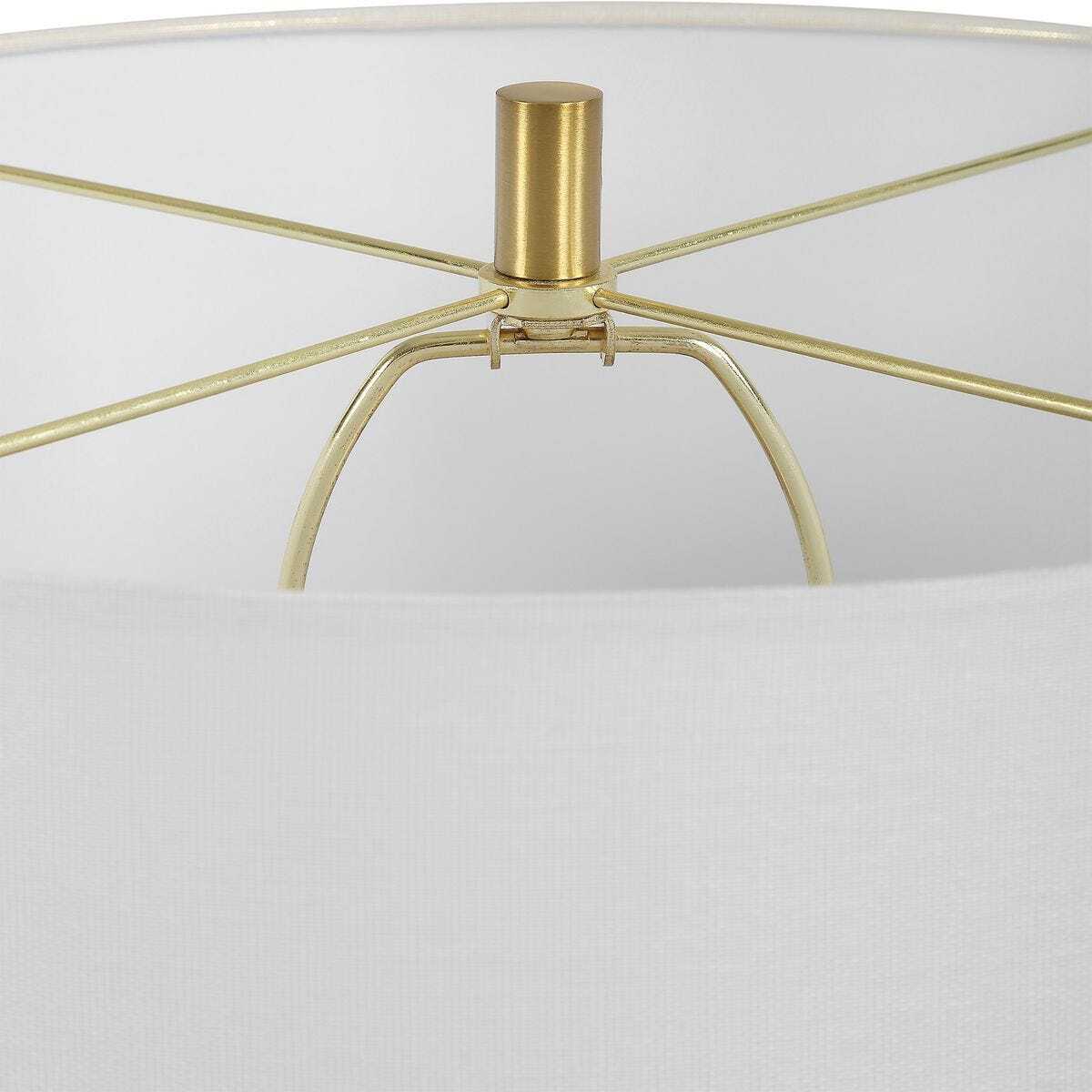 Featuring a captivating interplay of textures, this table lamp showcases a speckled matte finish set against lustrous, wavy bands in delightful hues of blue, brown, and yellow, accented by antique brass details. The round hardback shade is covered in a casual white linen fabric. Due to the nature of fired glazes on ceramic lamps, finishes will vary slightly.