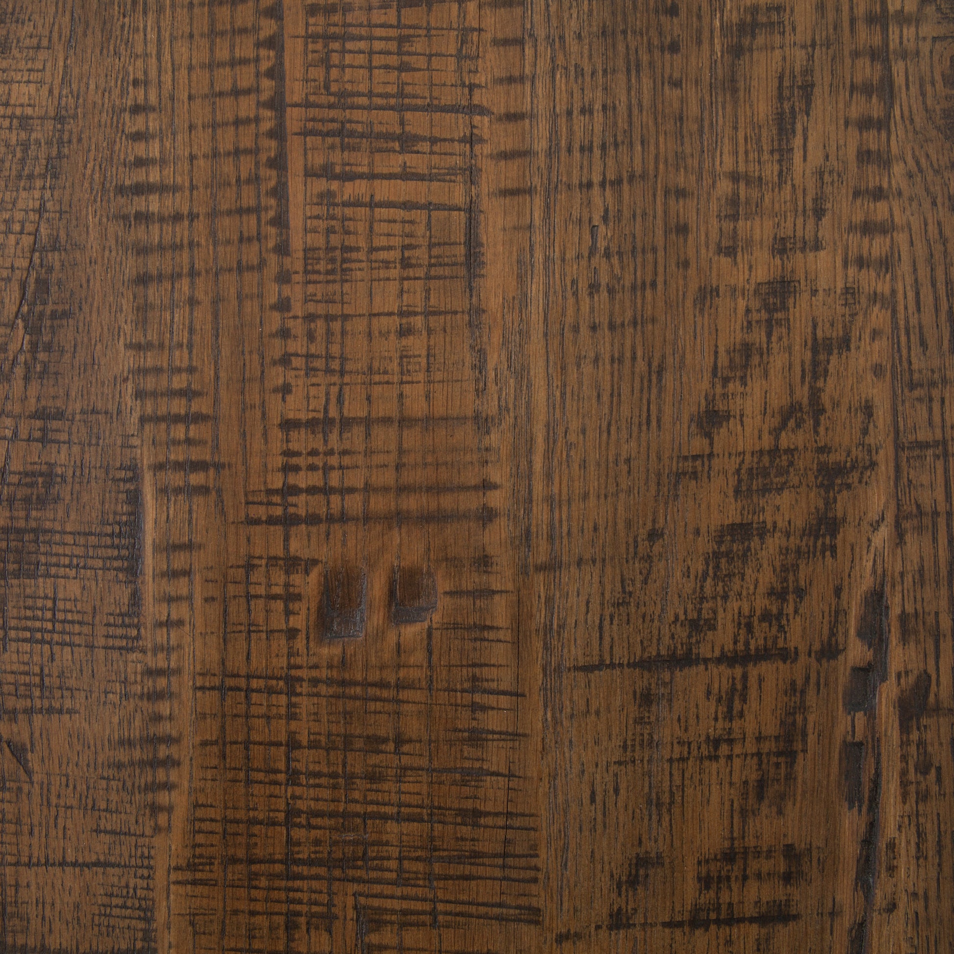 Trestle legs and a thick oak table top create a fine-dining focal point. Reclaimed woods are bleached to remove years of paint and stain, then finished with a neutral stain, soft lacquer, and layers of wax.