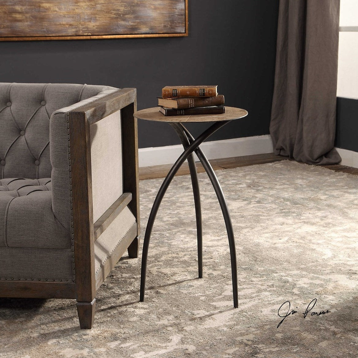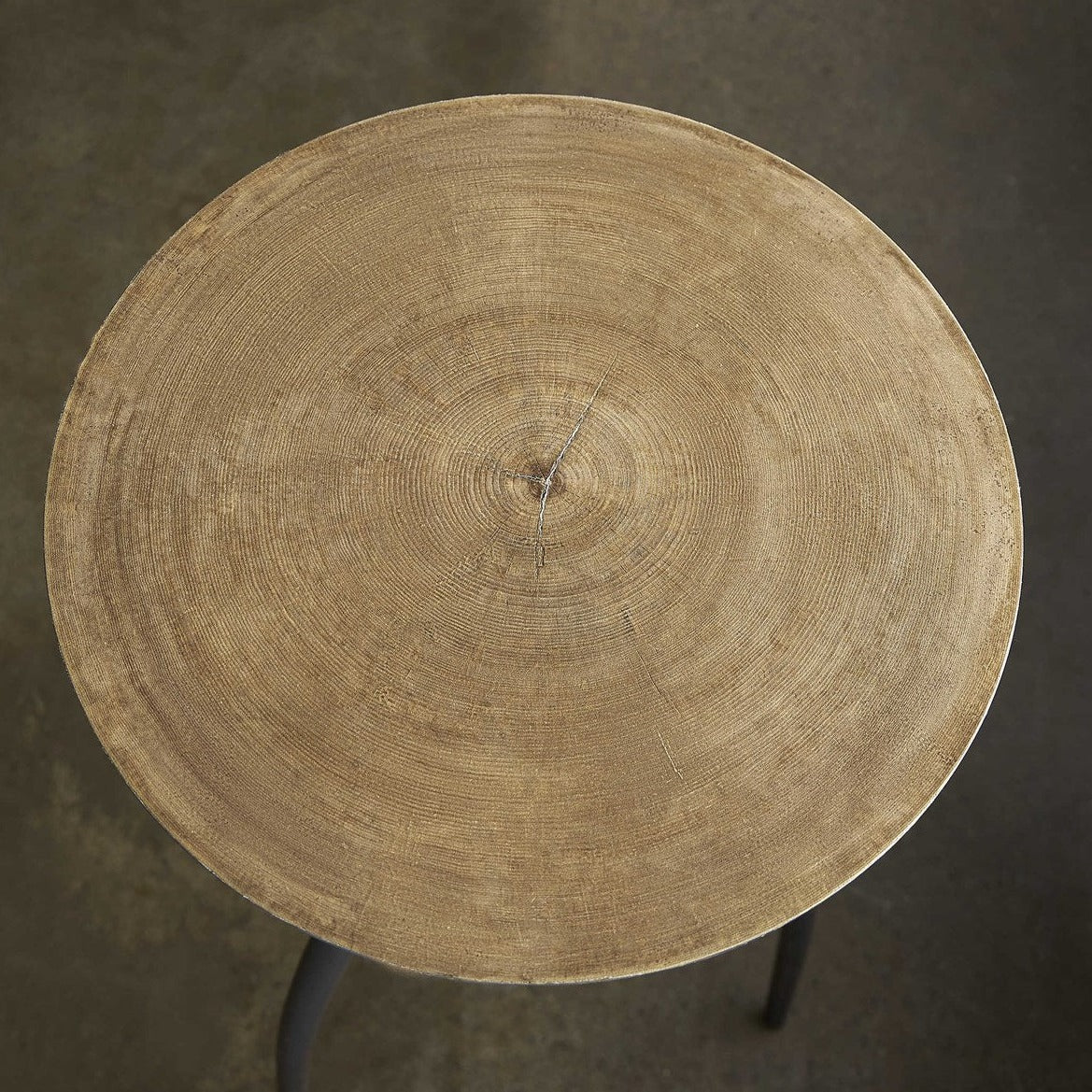 An end grain elm veneer top on an arched tripod iron base finished in aged steel.