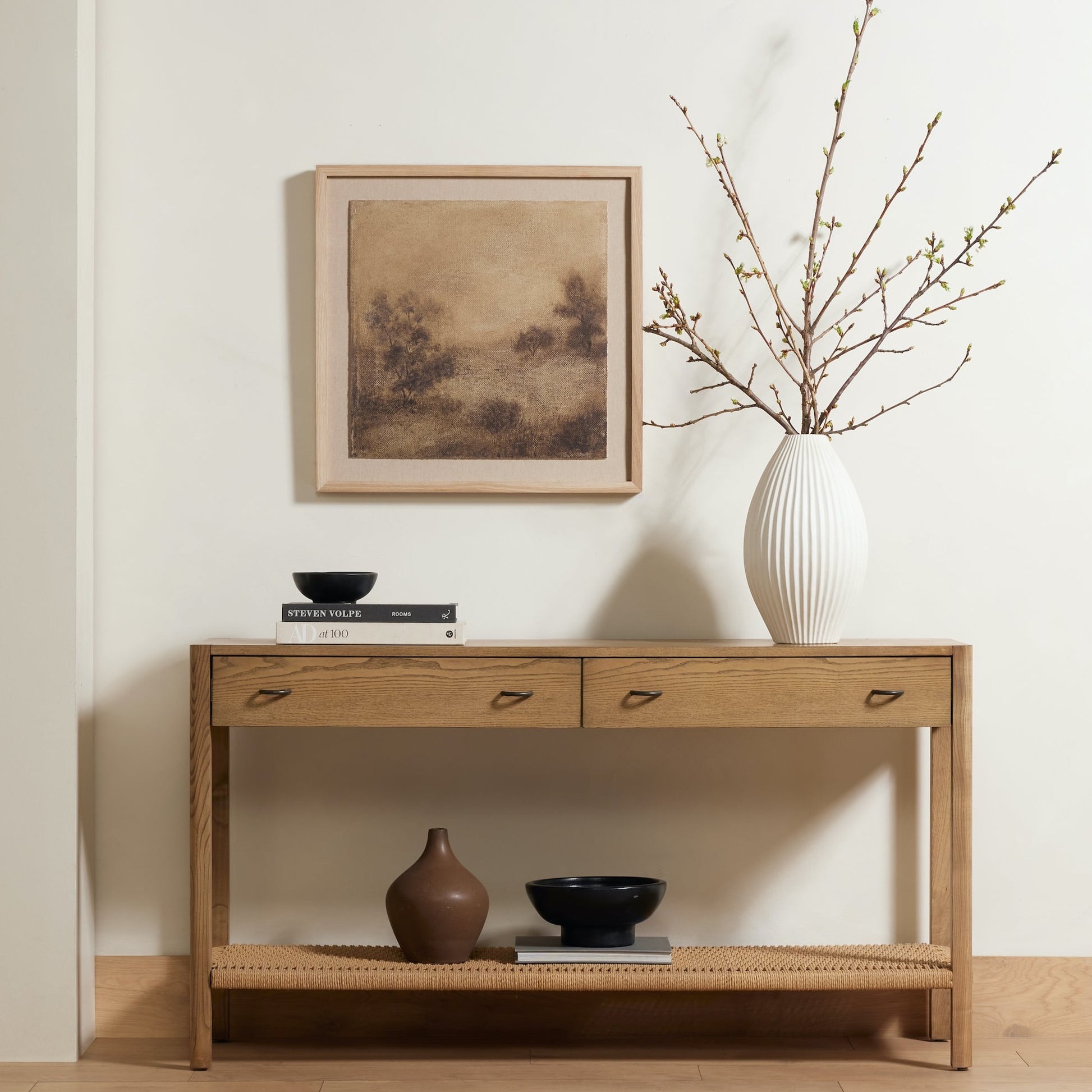 Danish-inspired design, refined shaping. Made from solid ash with dual drawers, open shelving of woven paper cord further ups storage and display options.
