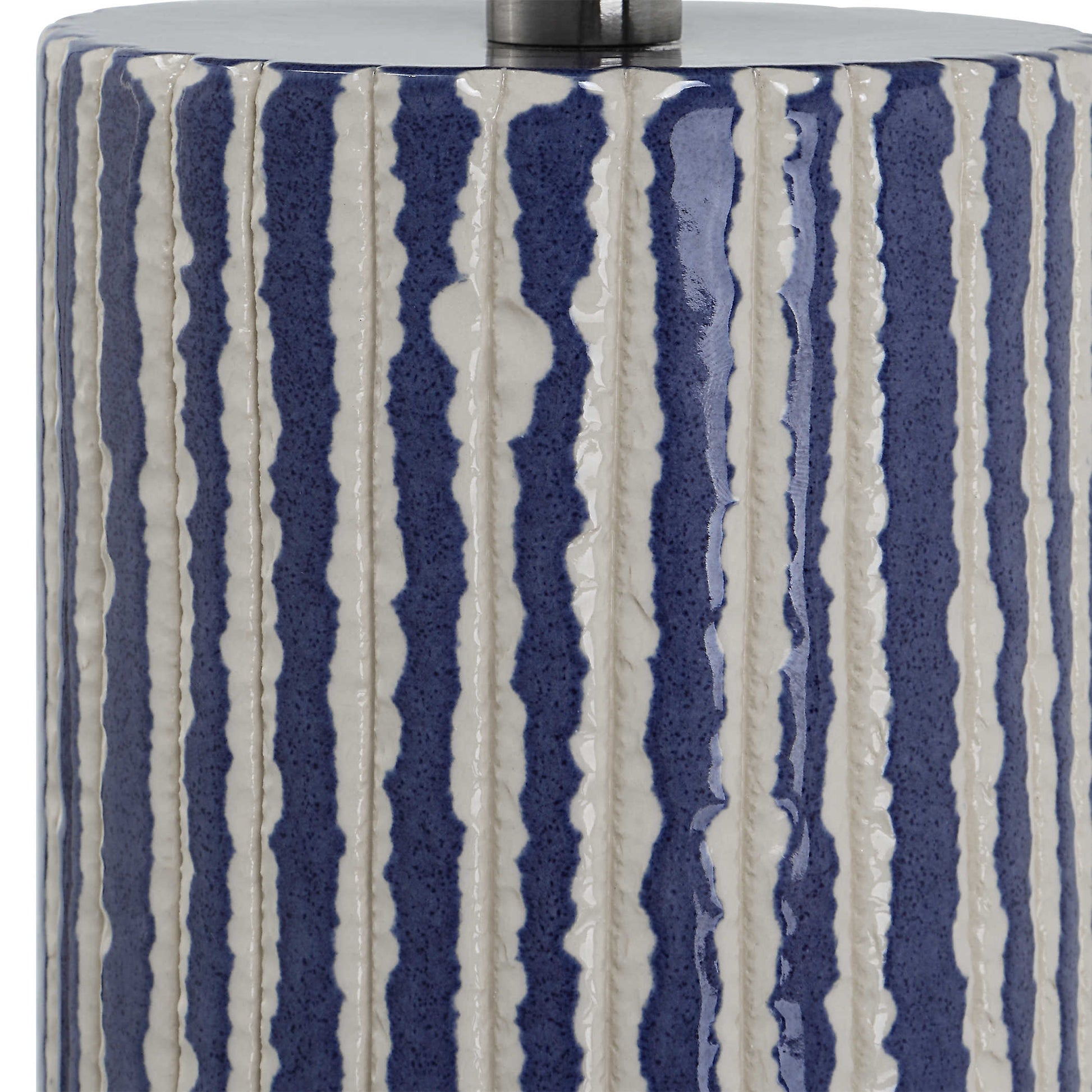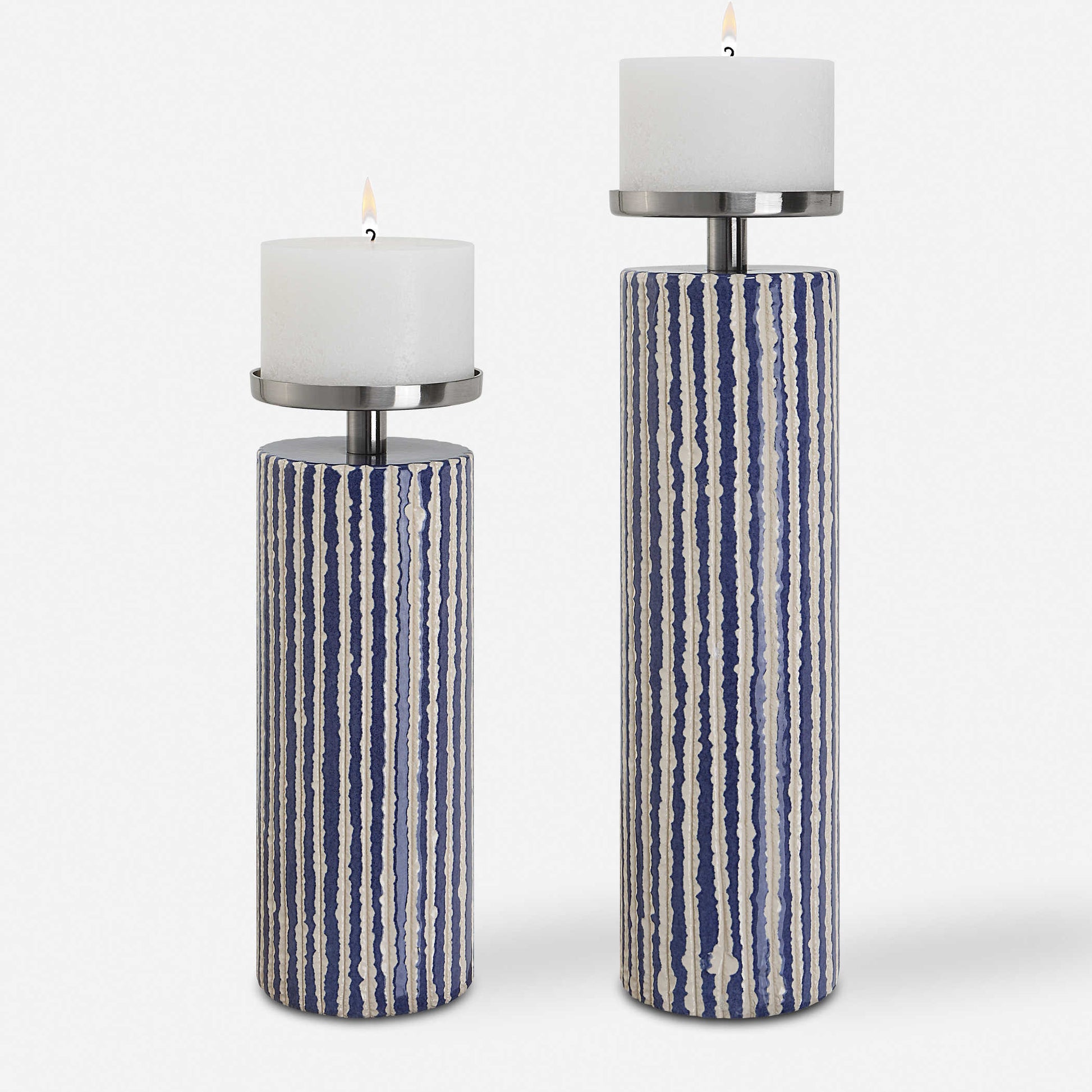 Set of two ceramic candleholders are finished in a vertically striped ivory and cobalt glaze, accented by iron candle cups finished in polished nickel with two 4"x 3" distressed off-white candles included. Sizes: S-4x14x4, L-4x17x4