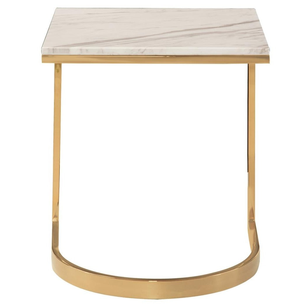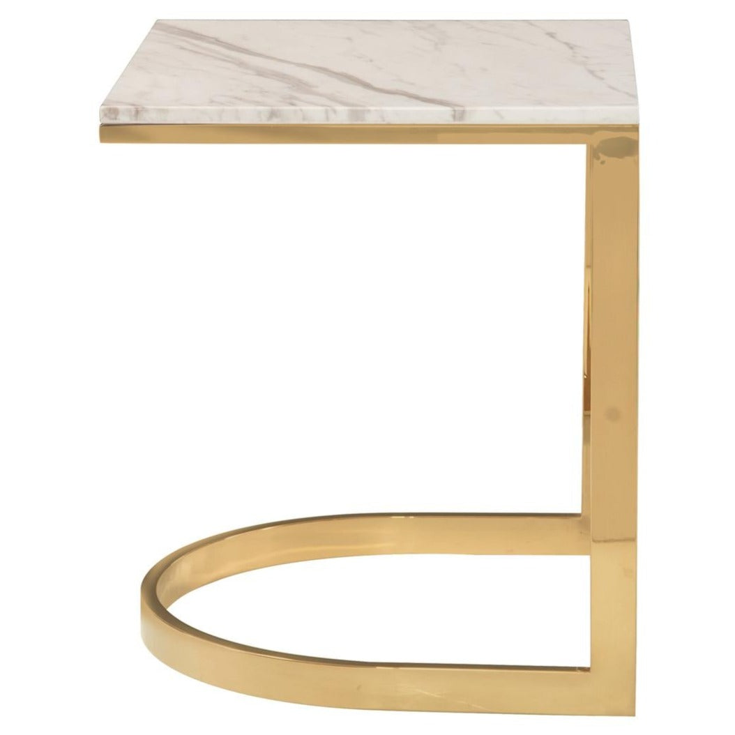 This end table showcases a white marble top supported by a steel base in a lustrous polished brass finish. The square marble top with the semicircular base elevates the appeal of this dynamic piece.