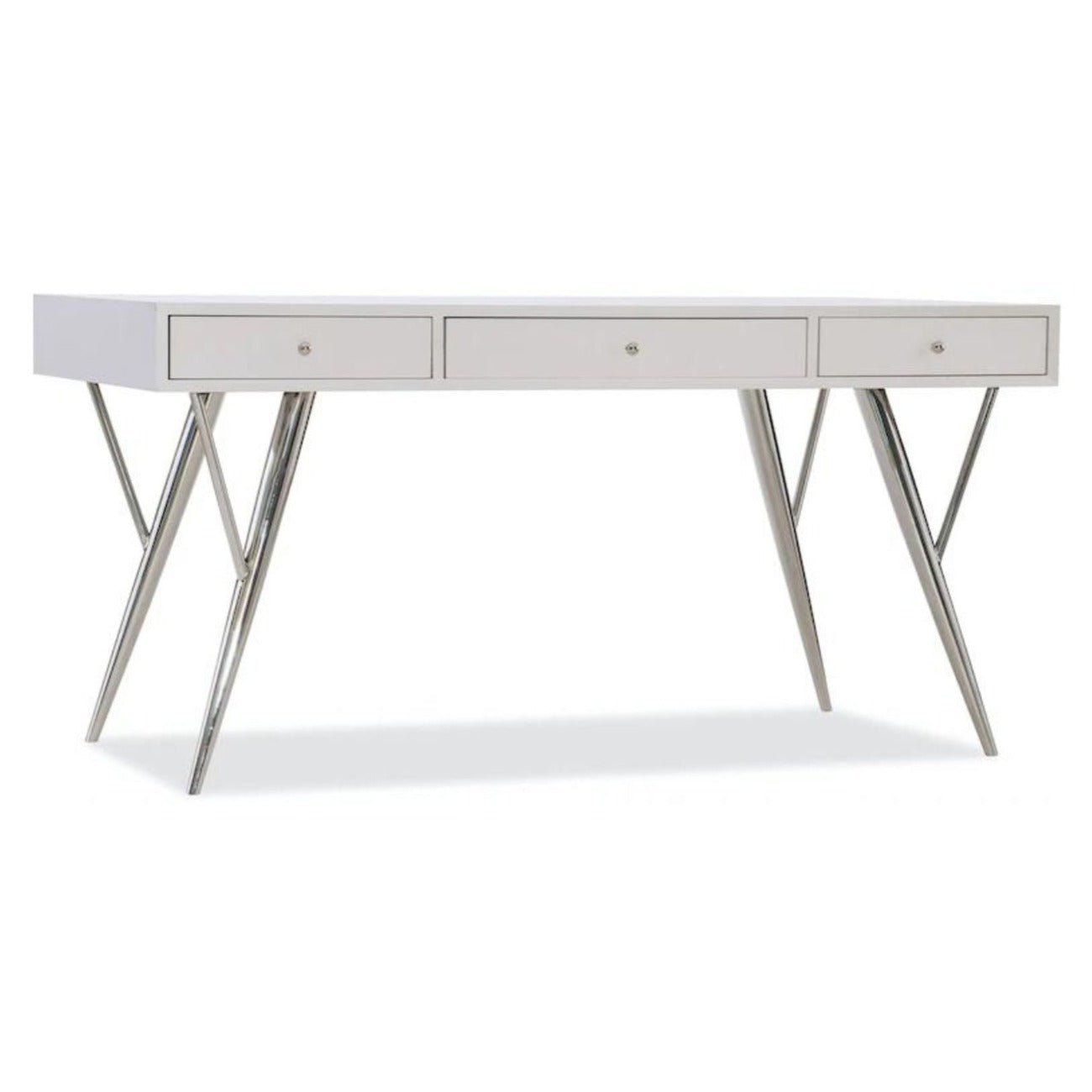 In a glamorous color palette of whites, creams and silver, the 50 in. Sophisticated Contemporary Writing Desk has a pearl white finish with polished stainless steel hardware and angled slender legs. Features include a center drop-front keyboard drawer, 2 outside utility drawers with 3 removable dividers, a pencil tray and one writing slide to be used in either drawer. A simple 3-piece office group featuring a writing desk, lateral file and bookcase. A pearl white finish is accented by stainless steel components along with faux shagreen drawer fronts on the matching bookcase and lateral file.