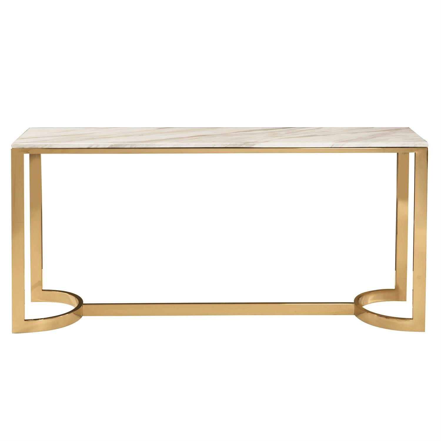 Console table showcases a stunning Jazz White marble top supported by a steel base in a lustrous polished brass finish. The juxtaposition of the semicircular ends with the rectangular marble top elevates the artistic appeal of this dynamic piece. With modern elegance and sophistication, this table brings effortless glamour to any interior.