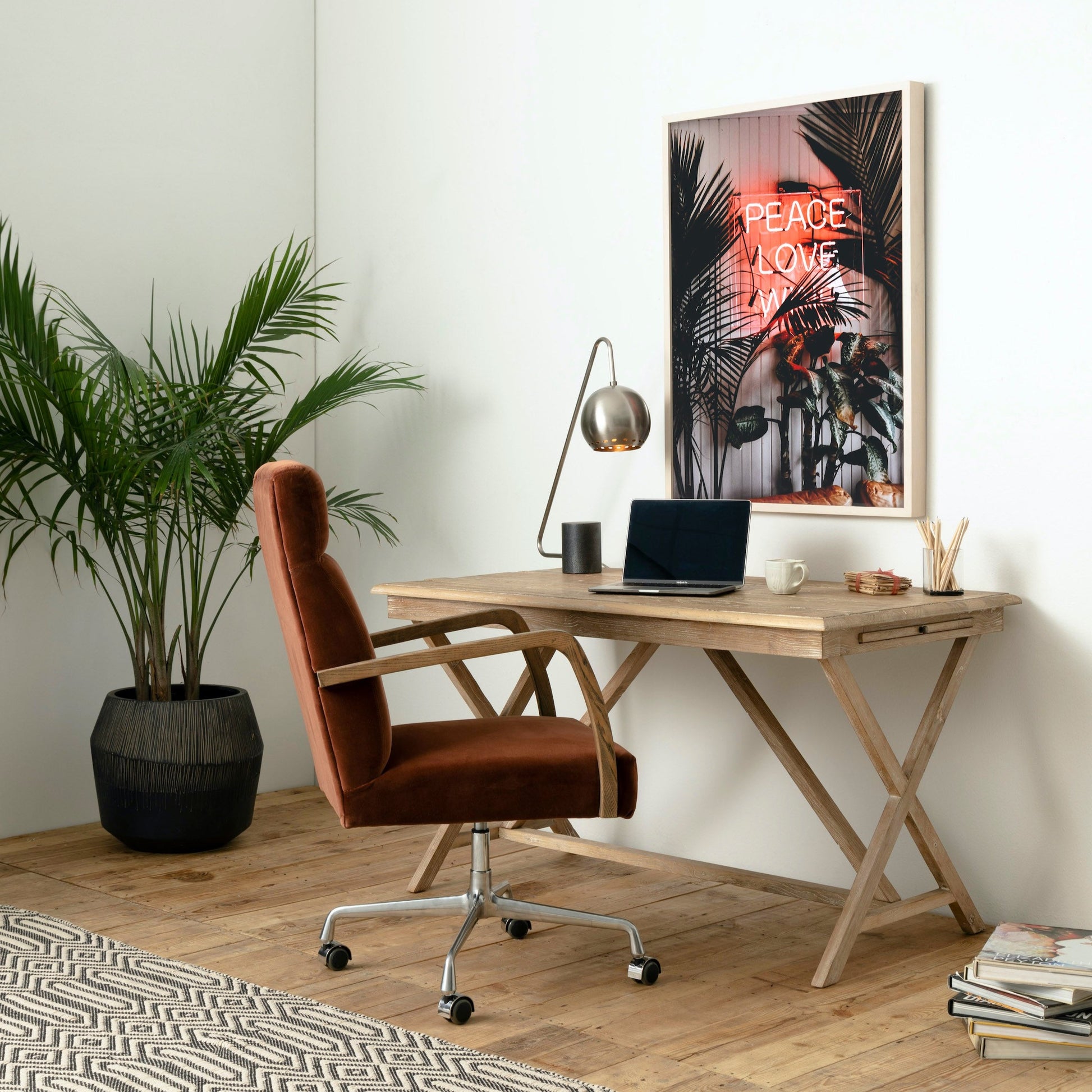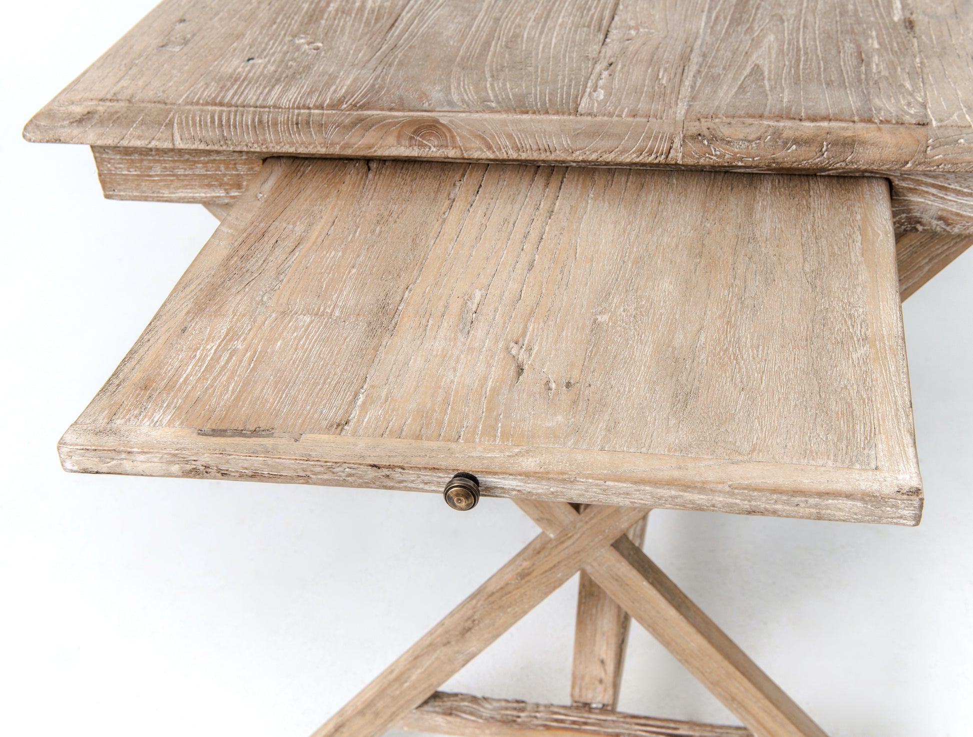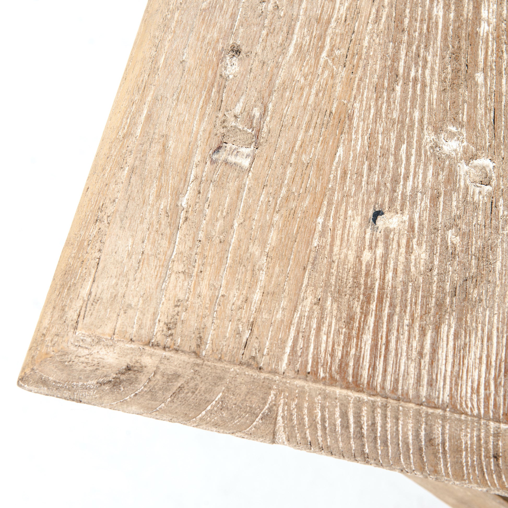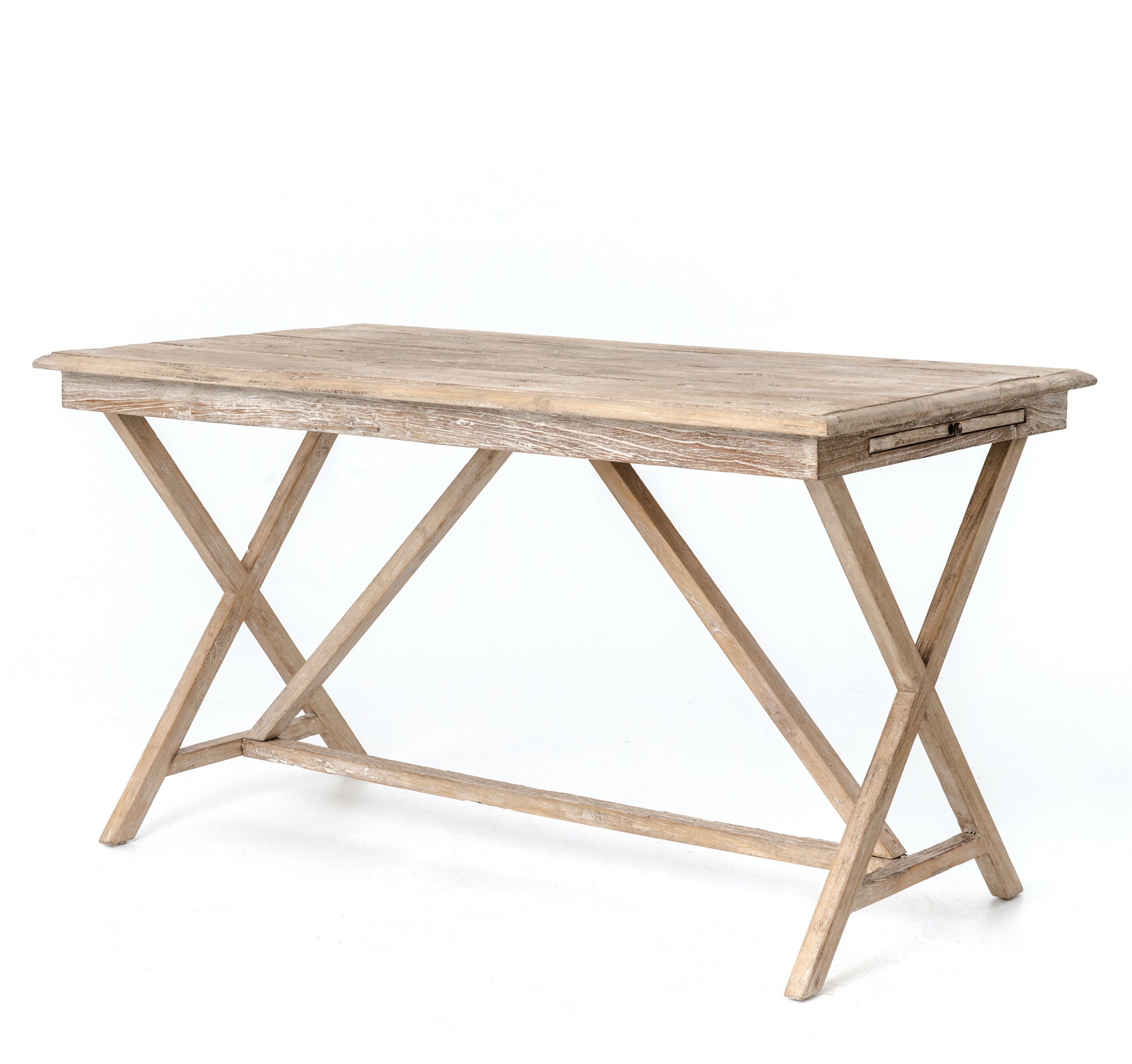 Criss-crossed and angled supports add architectural interest to a spare, French-inspired desk. A lightly whitewashed finish serves to bring out the warmth of the wood.
