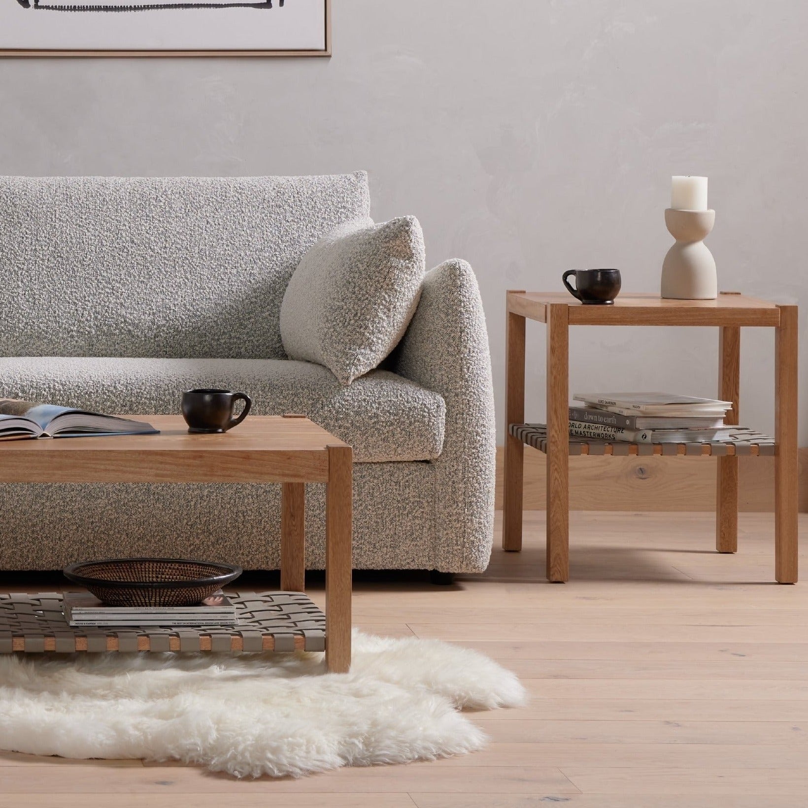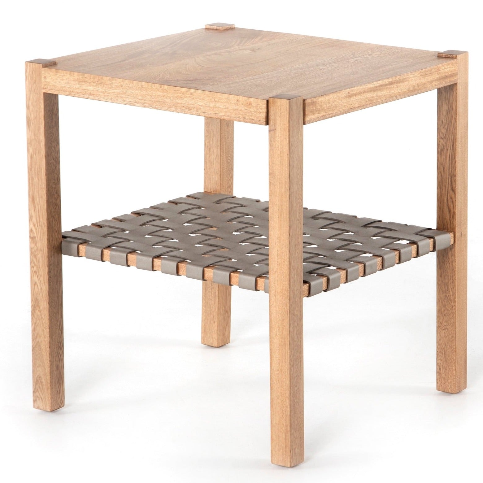 Thick-cut and smoke-grey in color, soft, top-grain leather is woven to create a floating lower layer below a clean, angular tabletop of natural Rosa Morada wood.