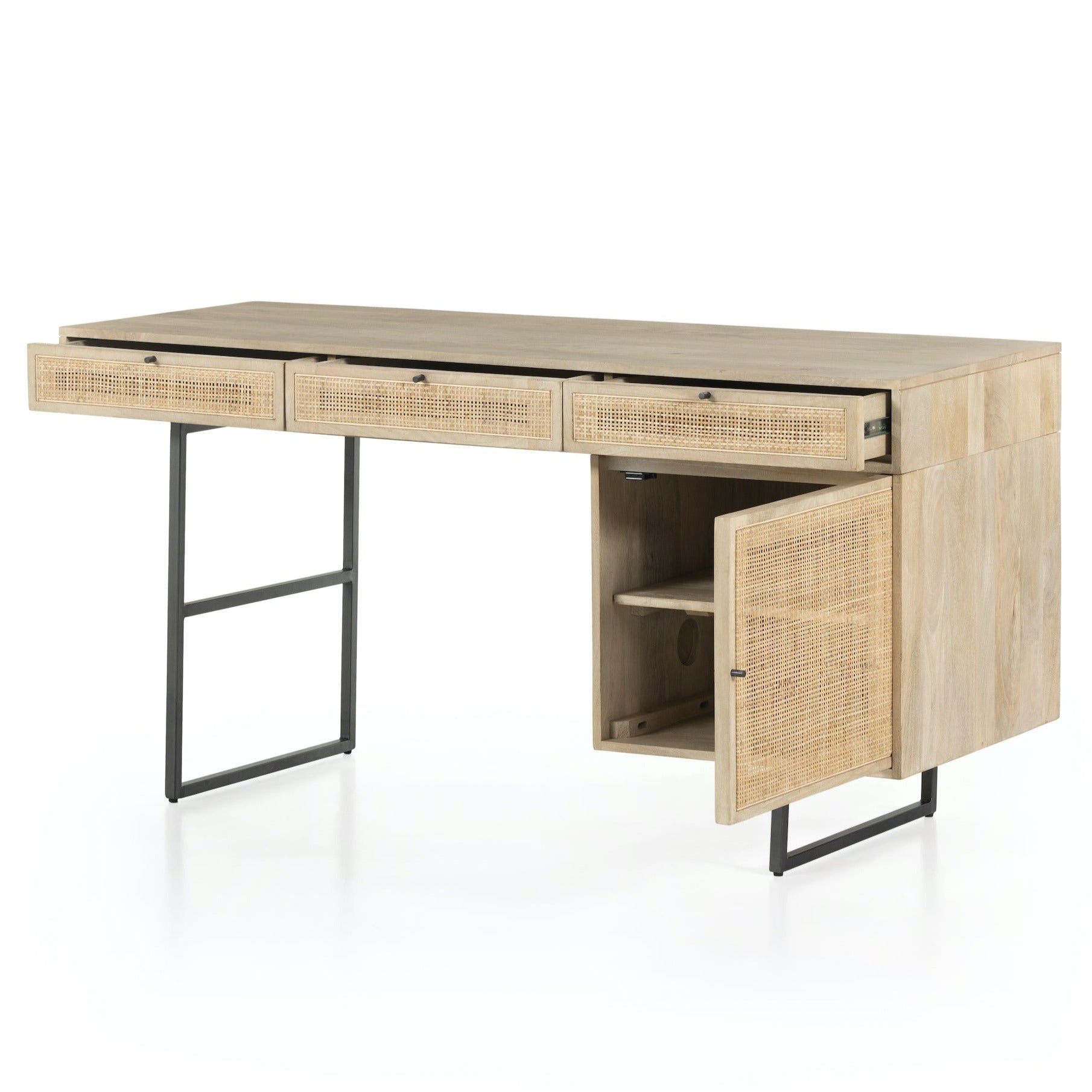 Surrounded by natural mango casing and a back stained to match, light cane door and drawer fronts weave for a fresh look with great depth. Angular gunmetal-finished iron legs offer an intriguing contrast of tone.