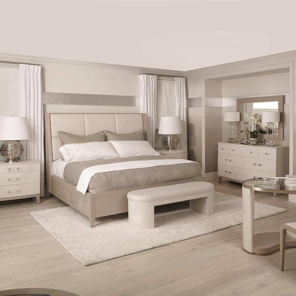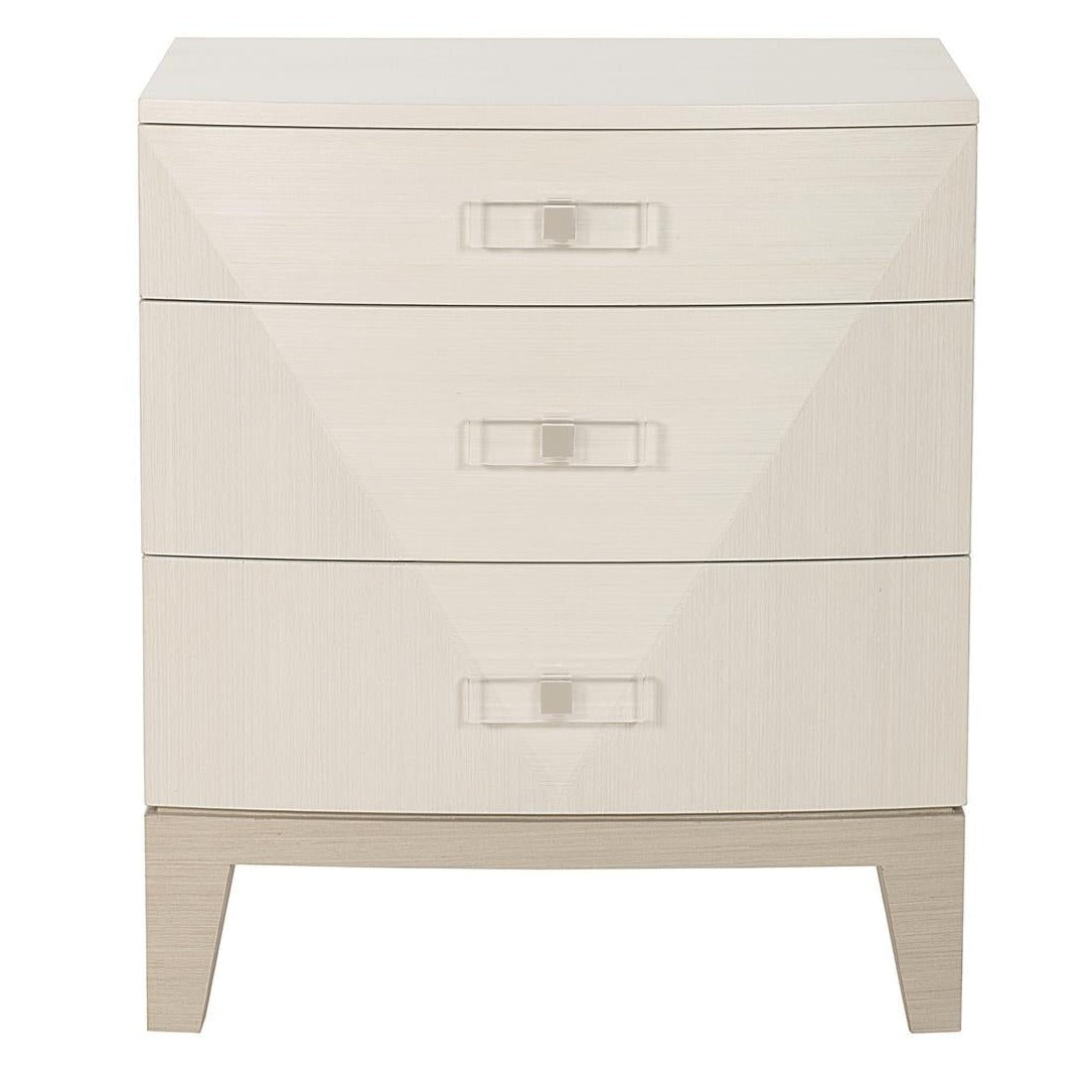 A glamorous transitional furniture collection with a modern slant. Crafted from poplar solids and engineered faux anigre veneers, the nightstand uses a sophisticated palette of silky yet low-sheen finishes. The softly curved front and inverted pyramid design elevate the visual appeal of this piece. Clear acrylic is combined with metal for hardware with a fresh and unique feel. With clean lines and a sleek form, this three-drawer nightstand remains a warm and inviting staple for the bedroom.